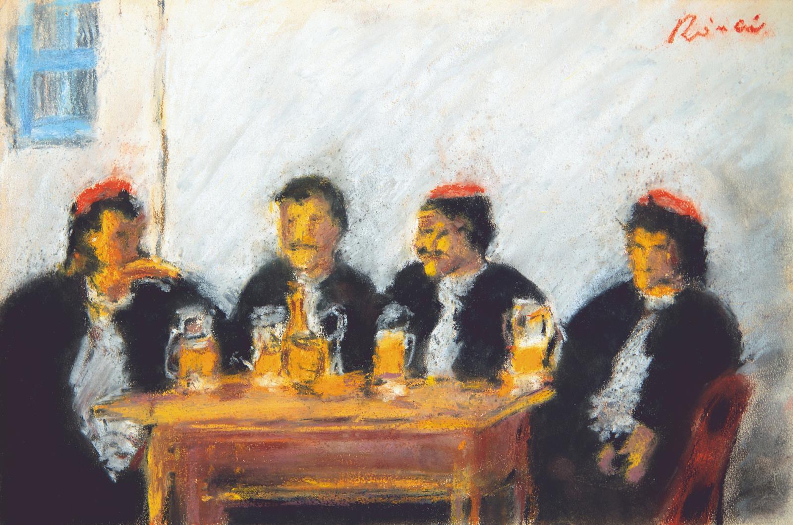 Four Men Drinking Beer around a Table, Drinking Companionship, around 1905