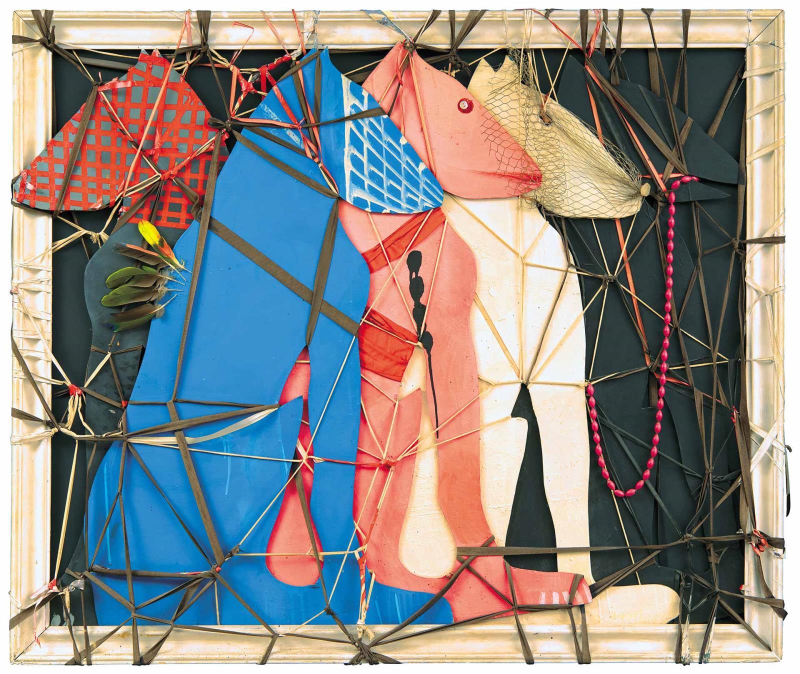 Cardboard, wood, oil, textile, feathers, string, button, plastic applications