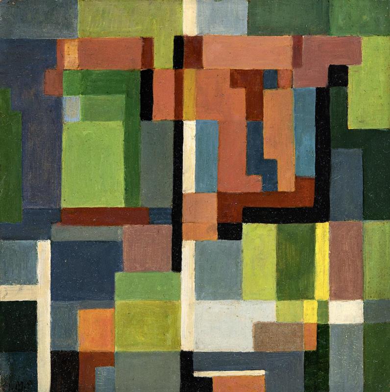 Signed bottom left: M. M. P. 1958, Inscription on the reverse: Monostori Moller Pál "falburkolat terv" 1958. of. 32x32 (1:5)