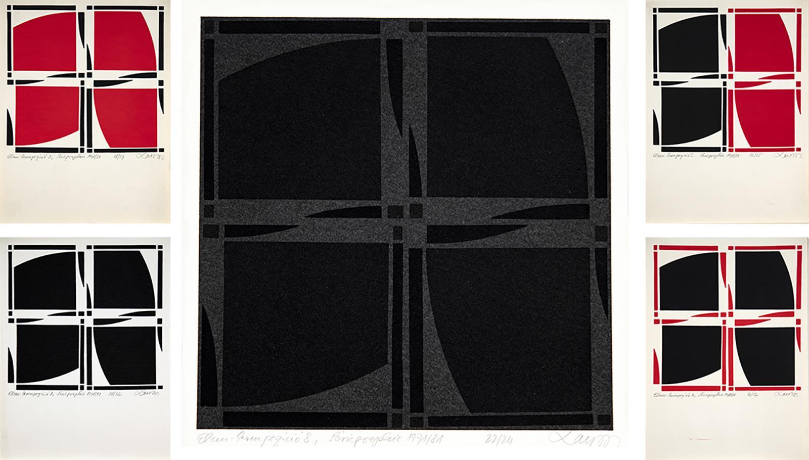 Signed bottom left: Elem-Kompozíció 1, 3, 4, 5, 8, Signed bottom center Seriegraphie 1971/81, 31/32, 28/37, 16/17, 12/2522/24, Signed bottom right: Lantos