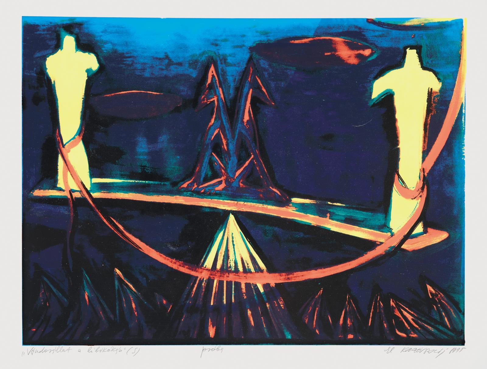 Signed bottom right: El Kazovszkij 1995, Signed bottom center: próba, Signed bottom left: "Vándorállat a libikókán" (S)