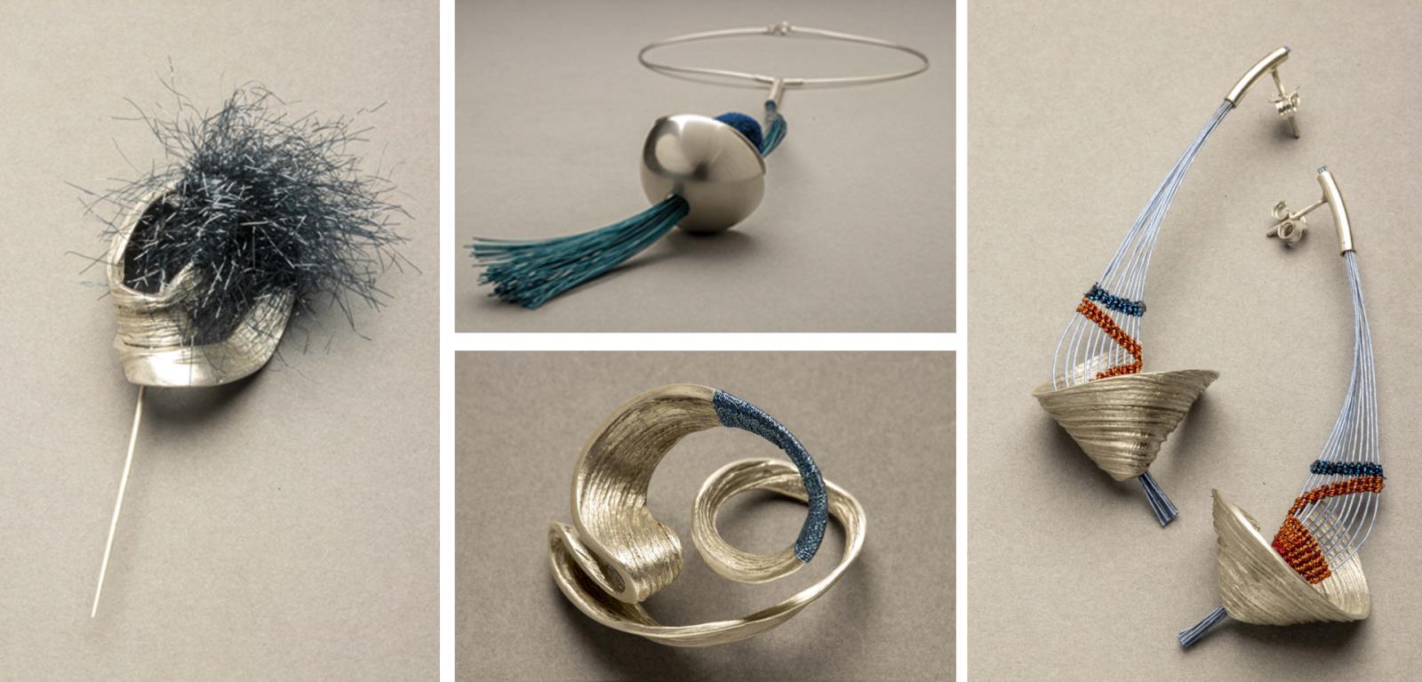 Gyűrű: ezüst, fémszálas fonal/ öntés, tekerés Nyakék: ezüst, sodronydrót, fémszálas fonal/ domborítás, öntés, csomózás, Fülbevaló: ezüst, sodronydrót, fémszálas fonal/öntés, csomózás, Kitűző: ezüst, fémszálas fonal/ öntés, fonás