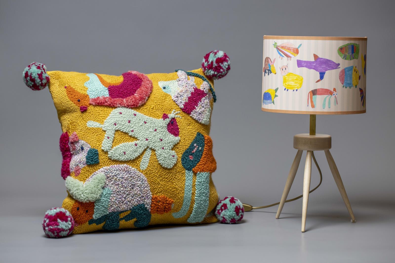 LÁmpa: fa, papír, 47 cm Párna: punch needle, gyapjú, len, párnatöltet, 45x45 cm