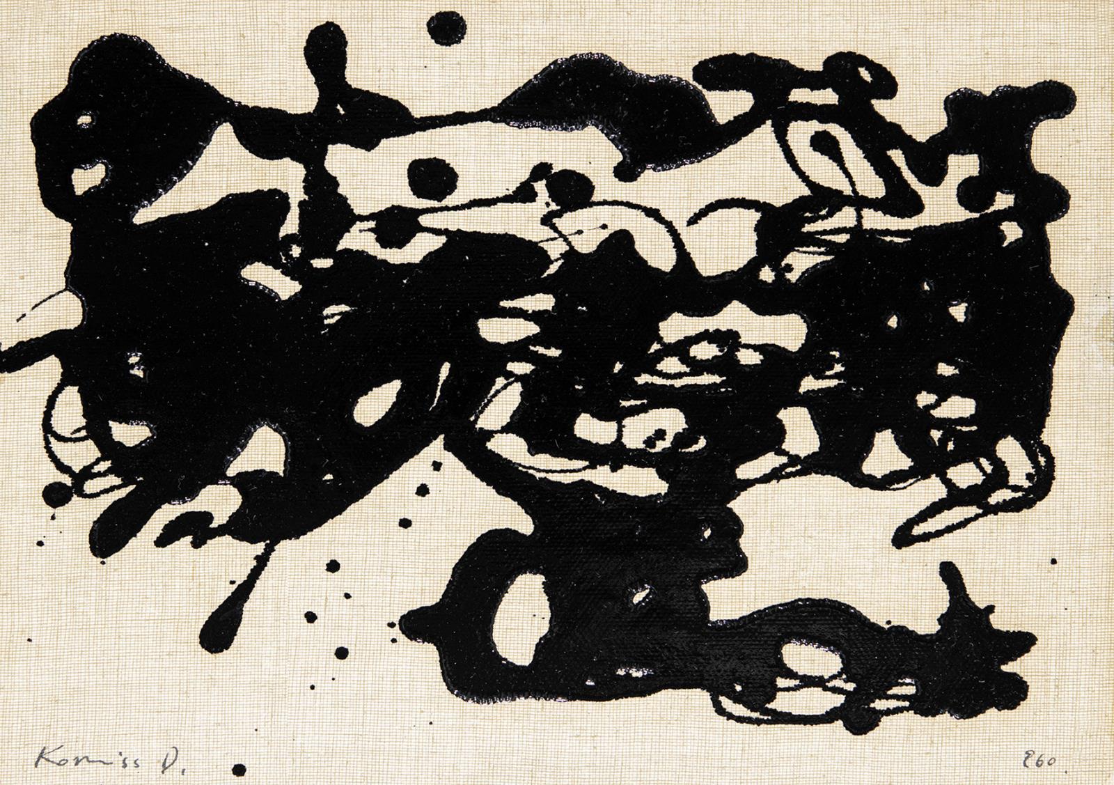 Signed bottom right: 960.; Signed bottom left: Korniss D.; Signed on the reverse: Korniss Dezső, Kalligráfia, 1960. Zománc vászon 20,5x39 + Nudelman matrica