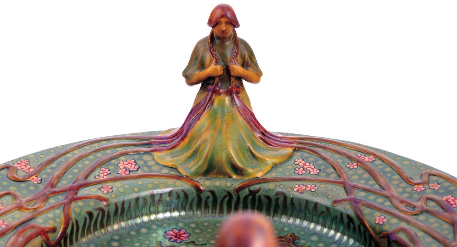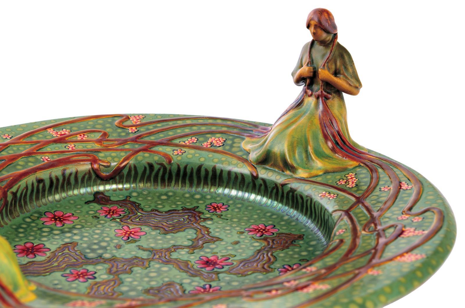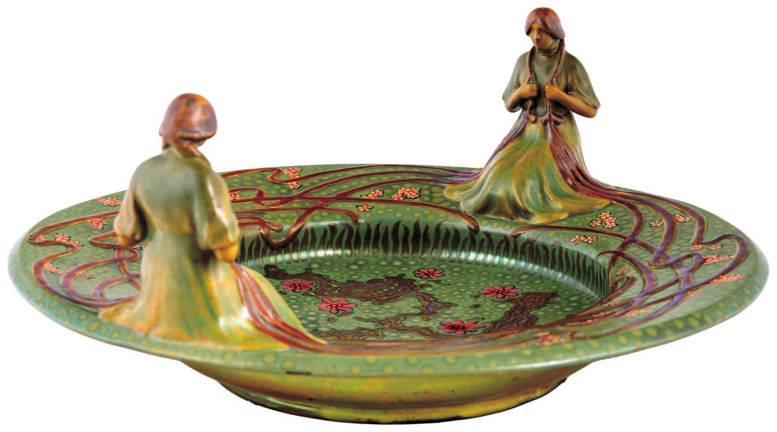 Centerpiece with Two Female Figures on the rim, Zsolnay, 1903, FORM PLAN BY: APÁTI-ABT SÁNDOR,, MODELLED BY: MACK LAJOS