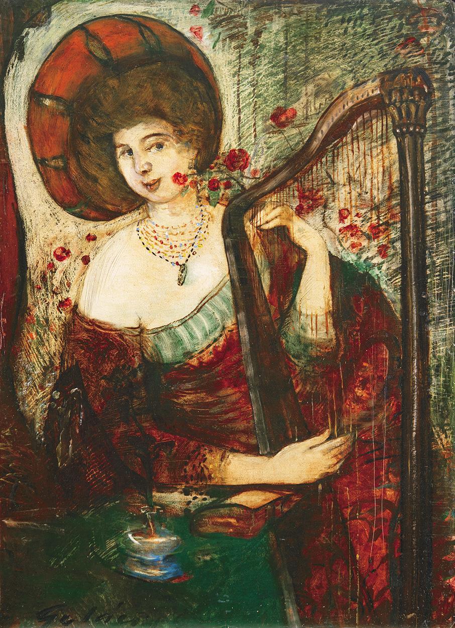 Lady playing an Old Instrument, Woman playing the Harp (Antique atmosphere), around 1910
