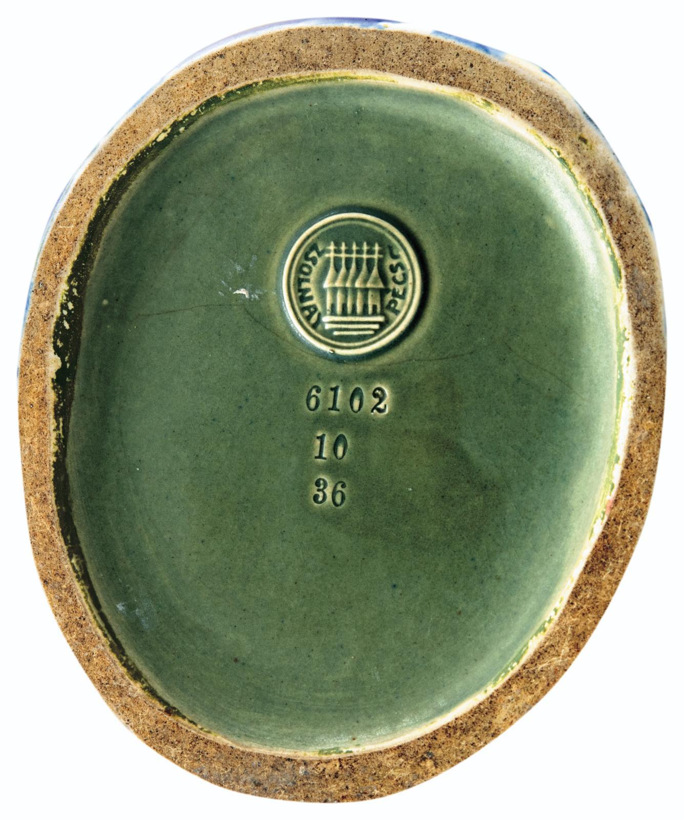 Jelzés: domború körpecsét, masszába nyomott 6102, 10, 36, a tárgy oldalán, a faun lábánál Mack Lajos benyomott jelzete, egy makk
