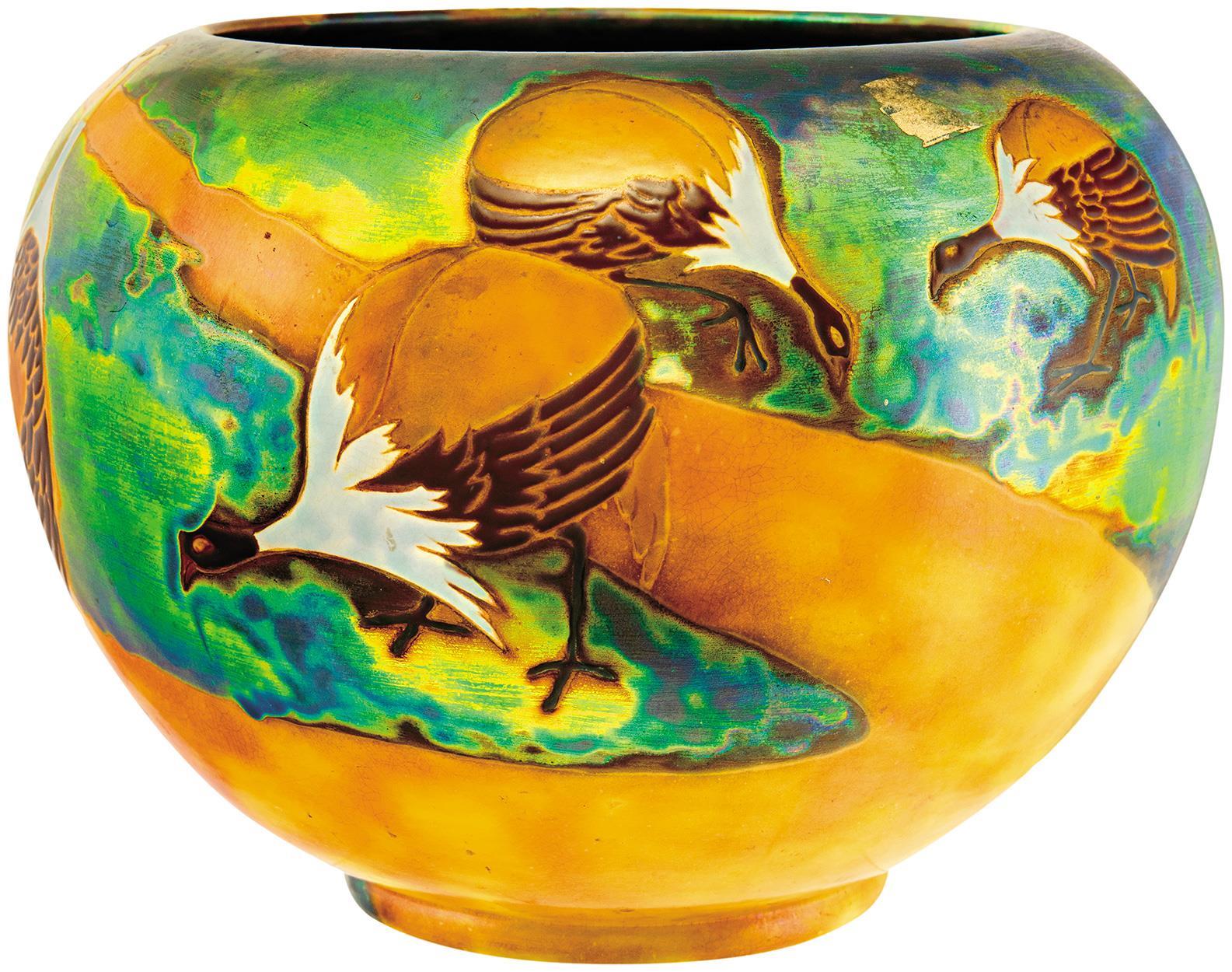 Virágtartó edény, díszmadarak panorámaképével, 1906, DEKORTERV FELTEHETŐEN: APÁTI ABT SÁNDOR