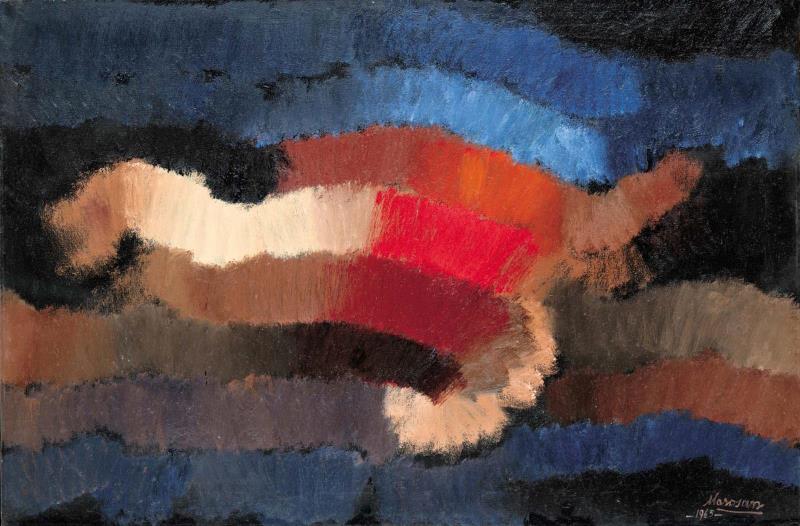 Jelezve jobbra lent: Marosán 1965, Jelezve hátoldalon: Marosán 1965 Színkompozíció 91x61 cm