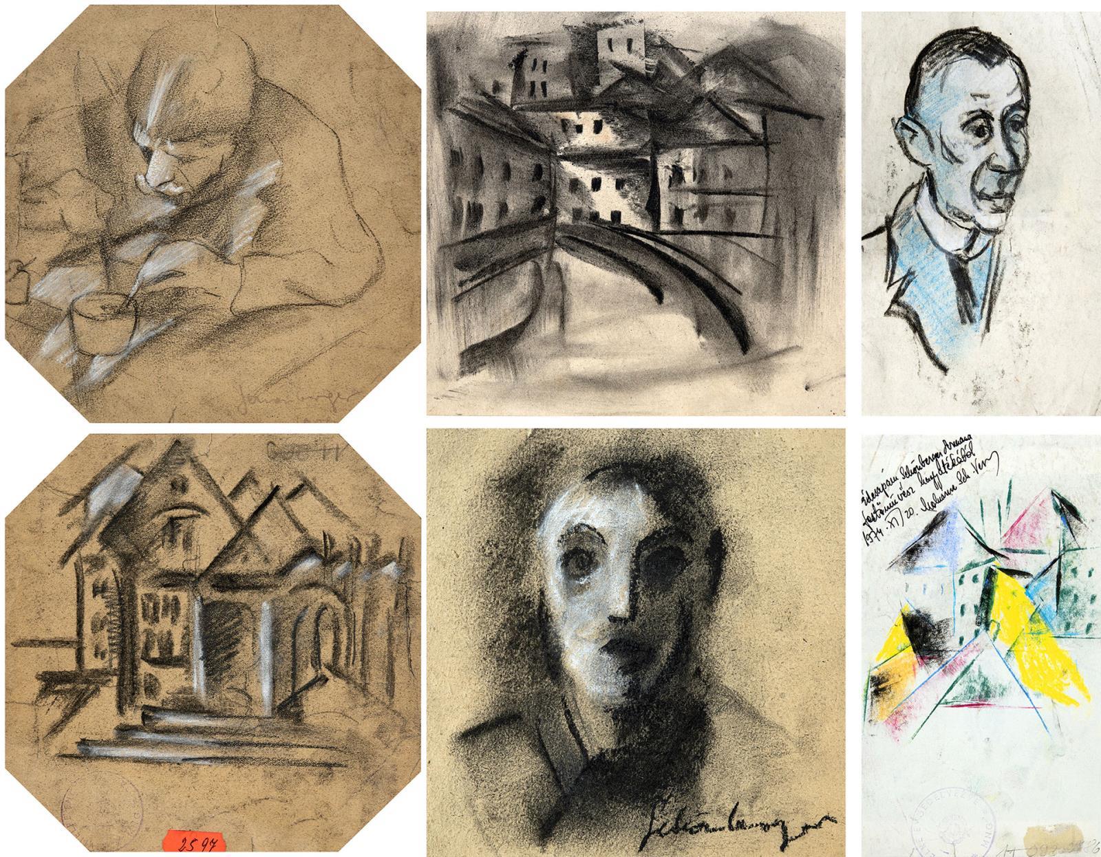 Városrészlet, hátoldalon: Asztalnál / Konstruktív város, hátoldalon: Női portré / Híd várossal, hátoldalon: Férfiportré