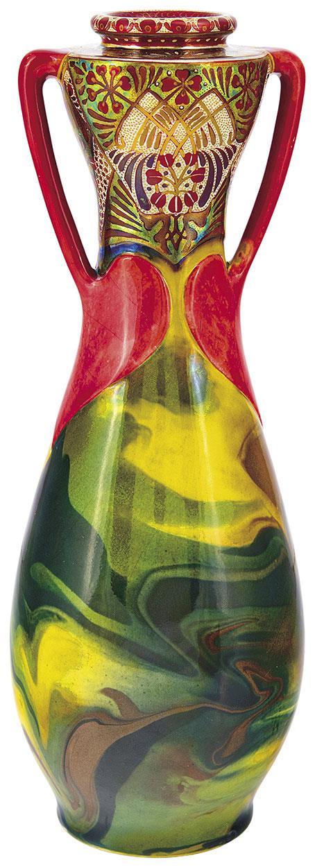Váza, levelet formázó fülekkel, Zsolnay, 1903, Terv: Apáti Abt Sándor