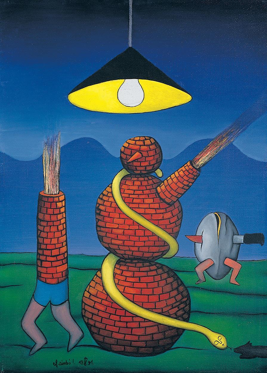 ef. Zámbó István H_2000 Szentendre Bartók u. 8. Piros hóember 70 x 50 olaj-farost 1991