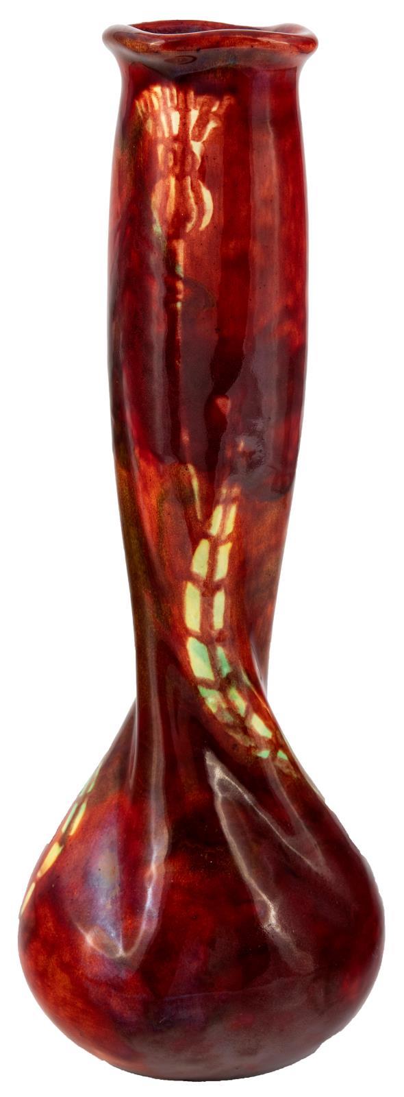 Váza, karcsú, csavart testtel, bogáncsos díszítéssel, Zsolnay, 1901, Terv: Sikorski Tádé