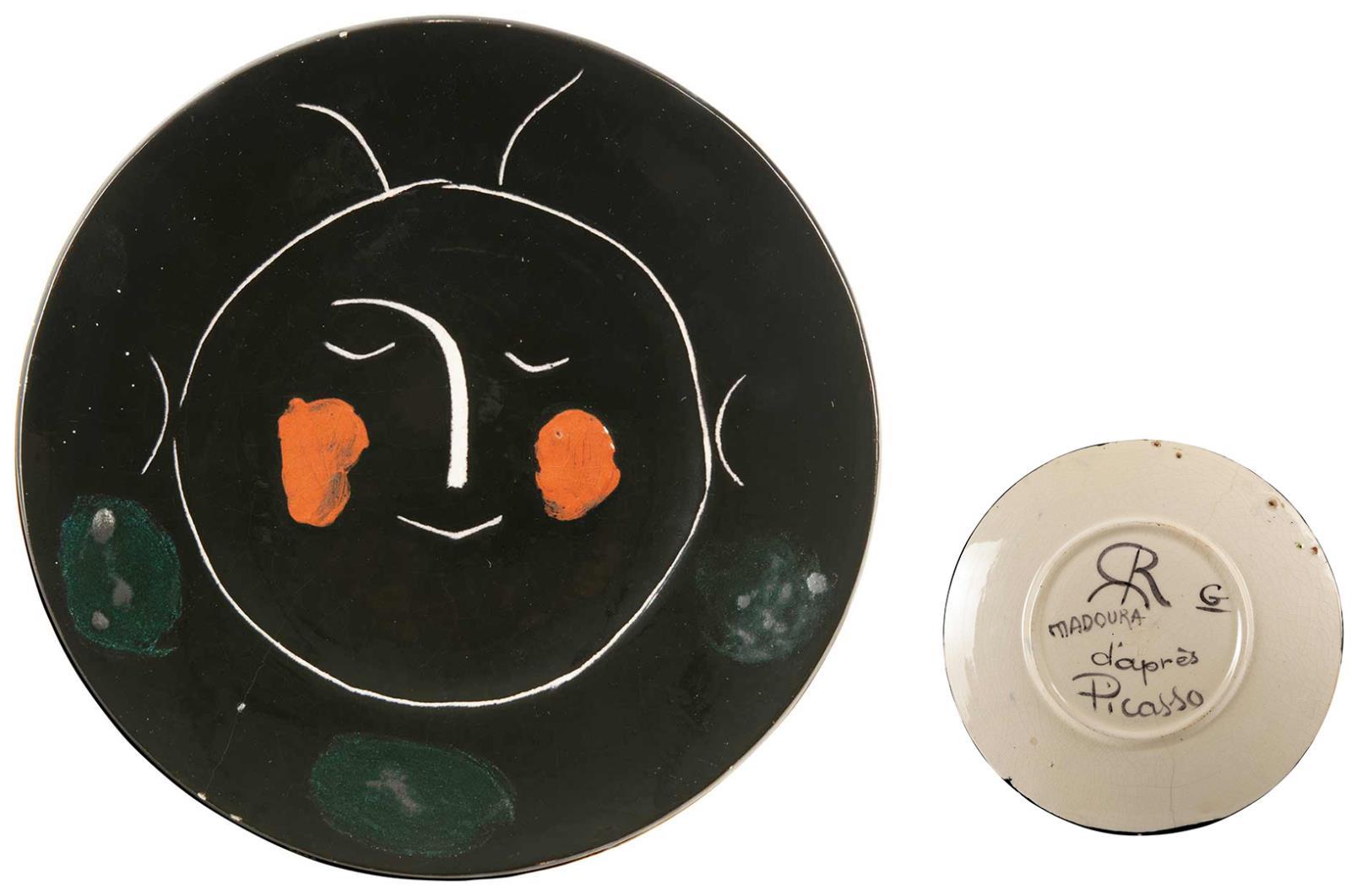 Jelezve alul: Masszába nyomott Madoura műhely jelzés, máz alatt festett jelzések: SR monogram, G, MADOURA d’après Picasso