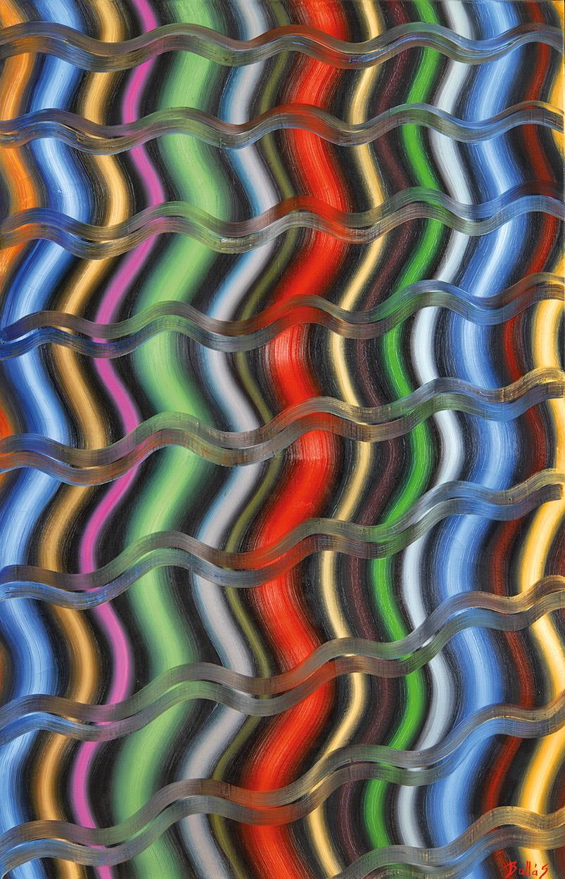 Jelezve jobbra lent: Bullás; Jelezve hátoldalon: Bullás József "A hullámon túl, a cserép hegyen innen!" 1998 olaj, vászon 140 x 90 Erzsinek és Gyulának Bullás
