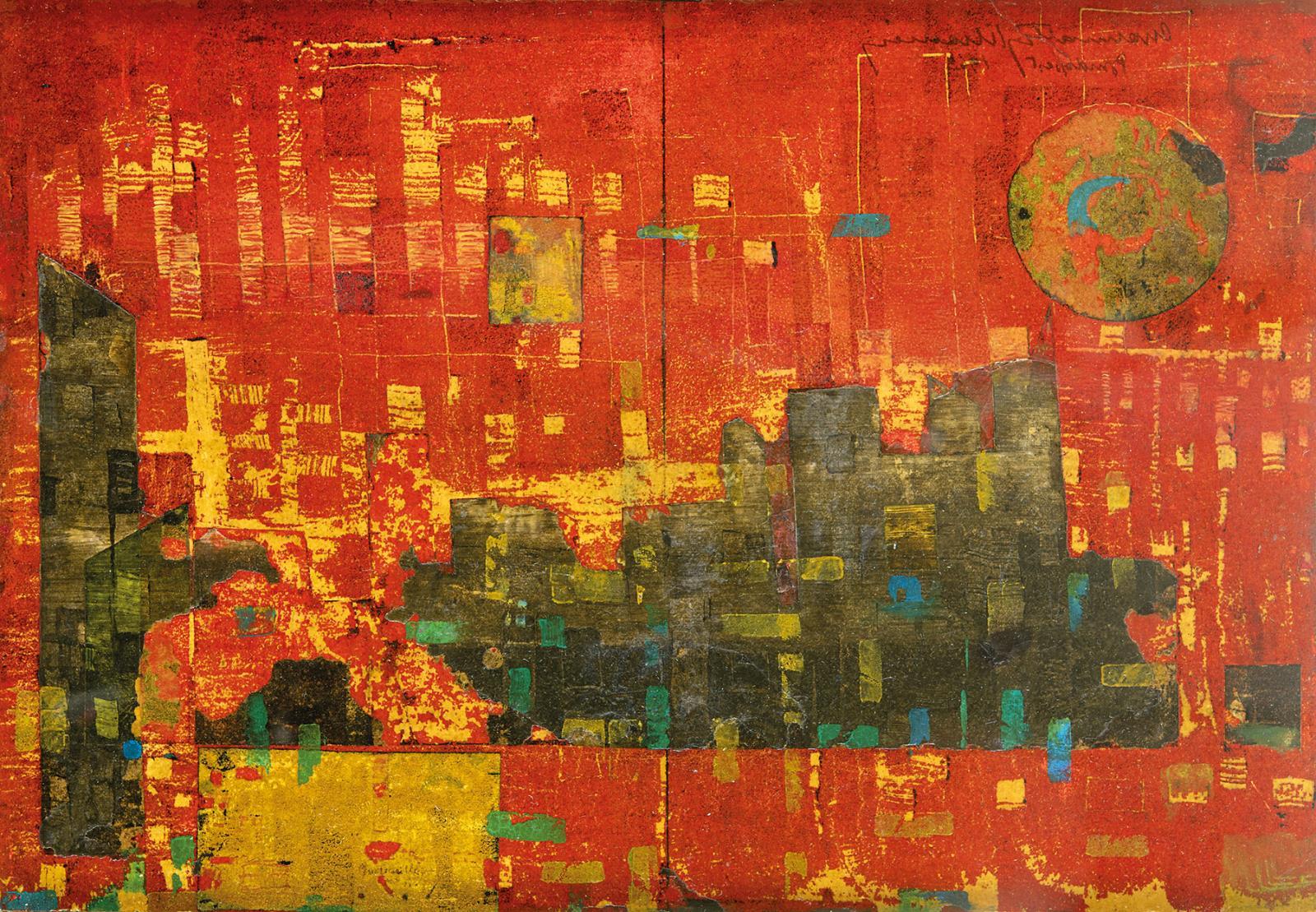 Olaj, kollázs, karton, fán