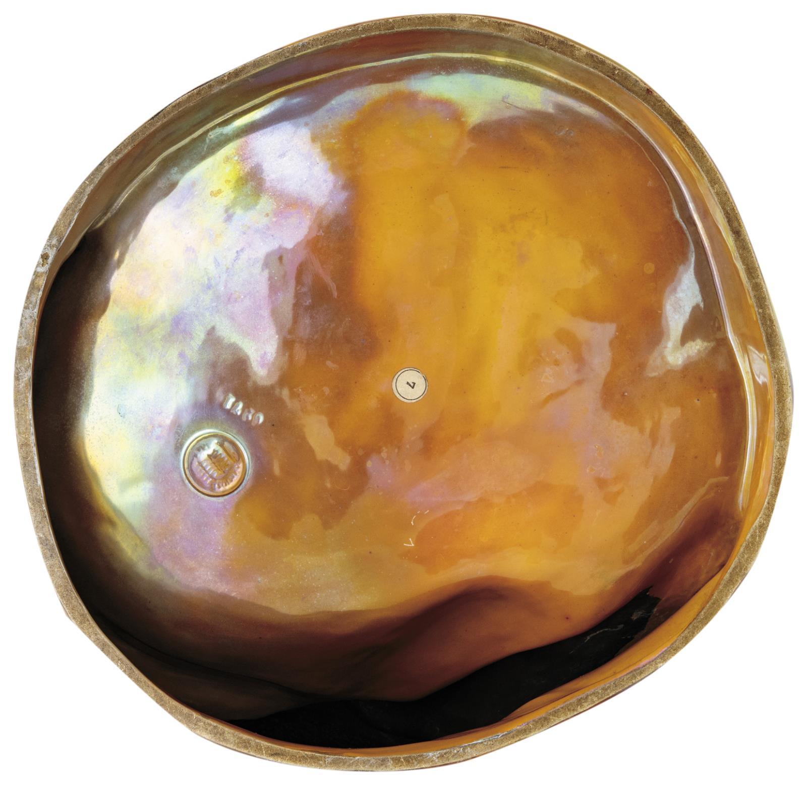 Színes, grés-mázas alapon eozinált színek, a savmaratás hatására selymesen irizál.