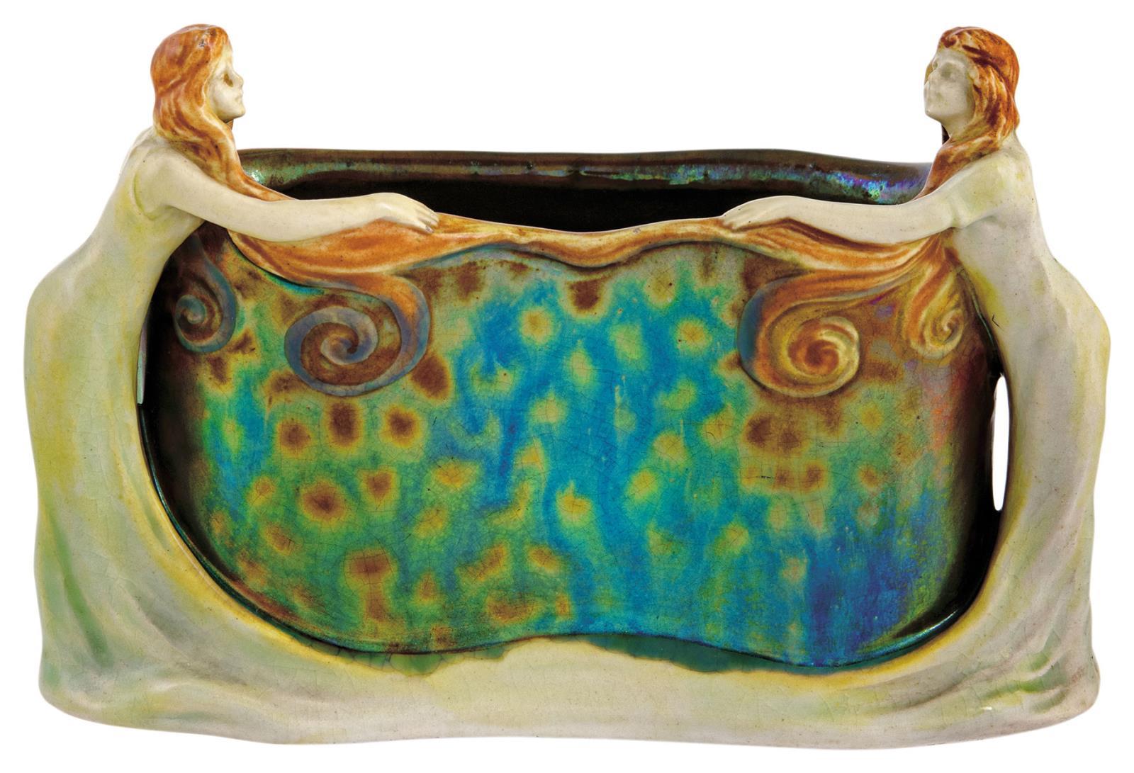 Jelzés: masszába nyomott ZSOLNAY PÉCS márkajelzés és 7489, 36, 1 FORMATERV FELTEHETŐEN: MACK LAJOSFAZONSZÁM: 7489Keménycserép, a szabadkézi formázású testen ráillesztett, finom kidolgozású figurákkal.A nőalakok eozinnal áthúzott, színes grés mázakkal festettek, a vázatest opak és transzparens eozinmázas, pettyezett mintás, savmaratott.
