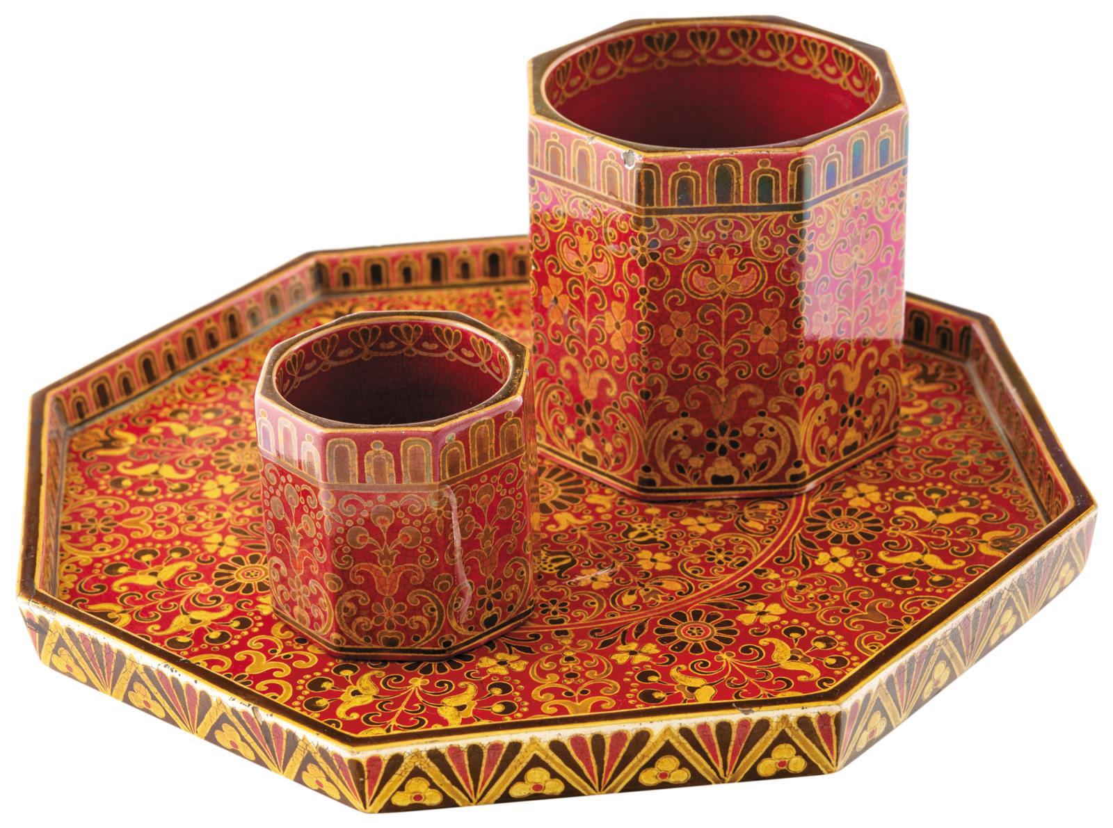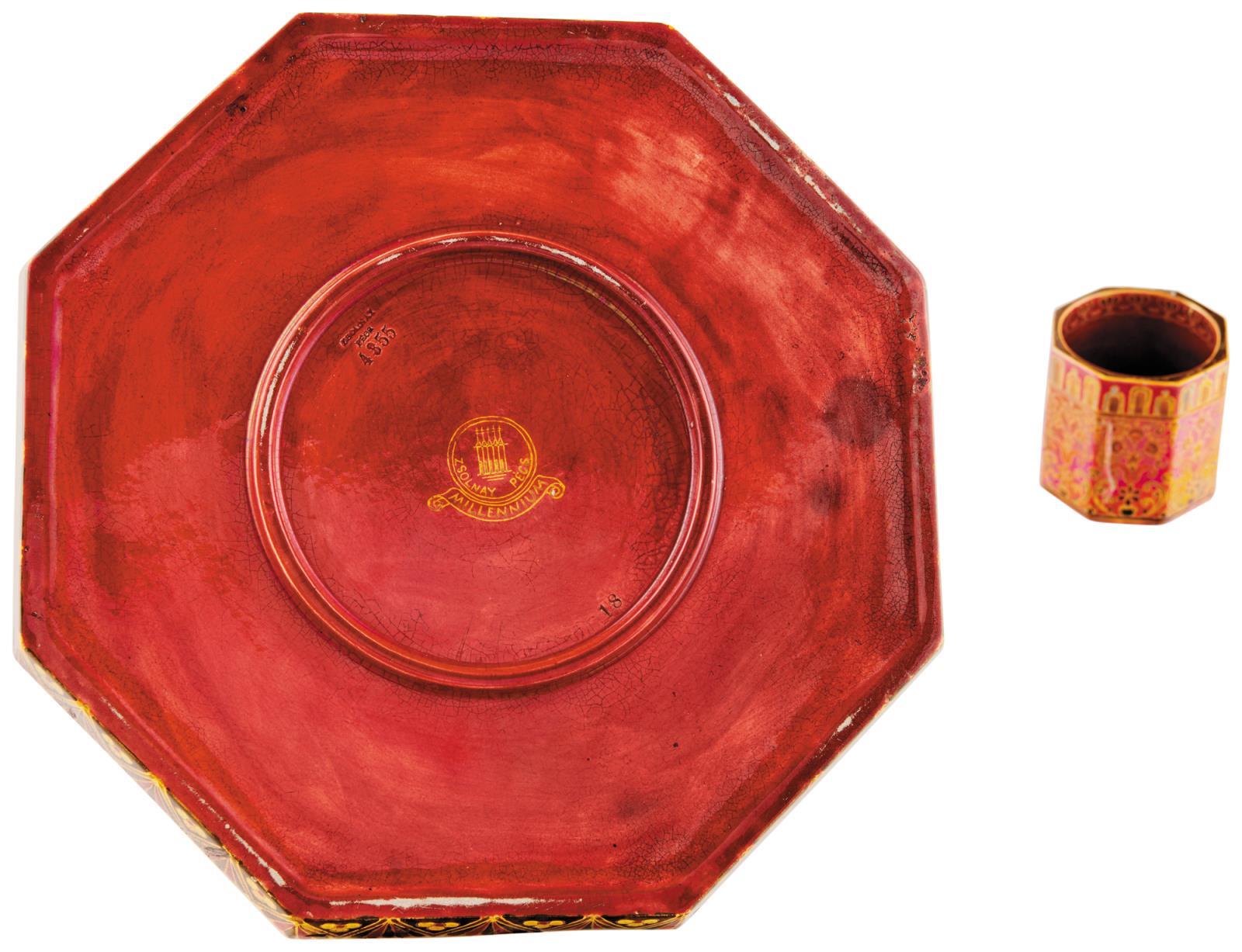Signed: Tray: hand-painted Millenium-trade-mark,impressed ZSOLNAY PÉCS trade-mark, numbers 4355, 18Cups : impressed ZSOLNAY PÉCS trade-mark, number of 4355