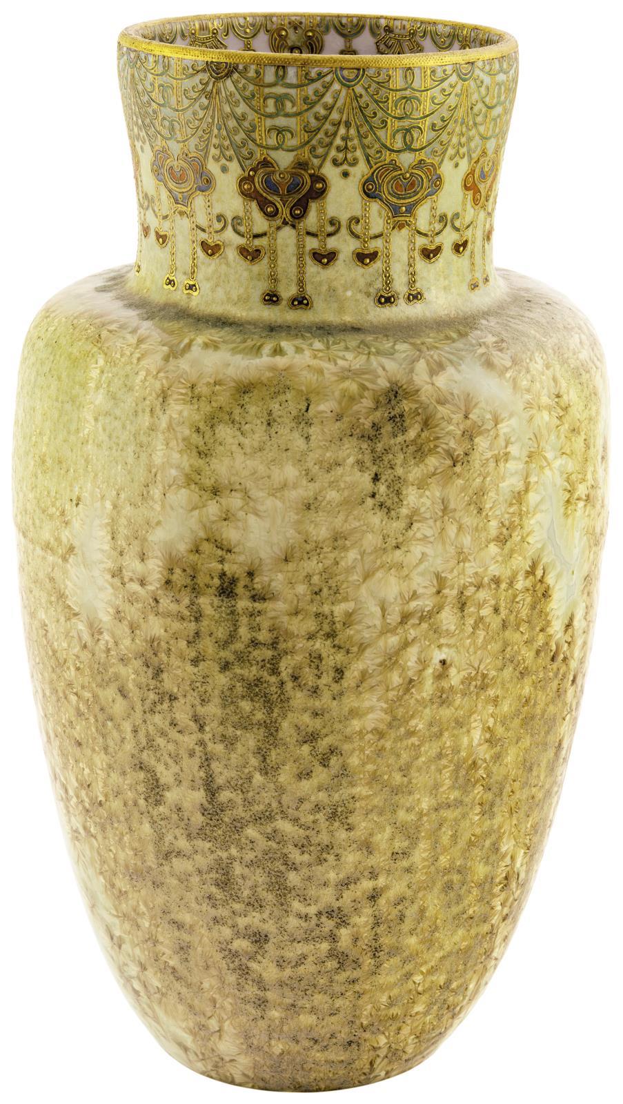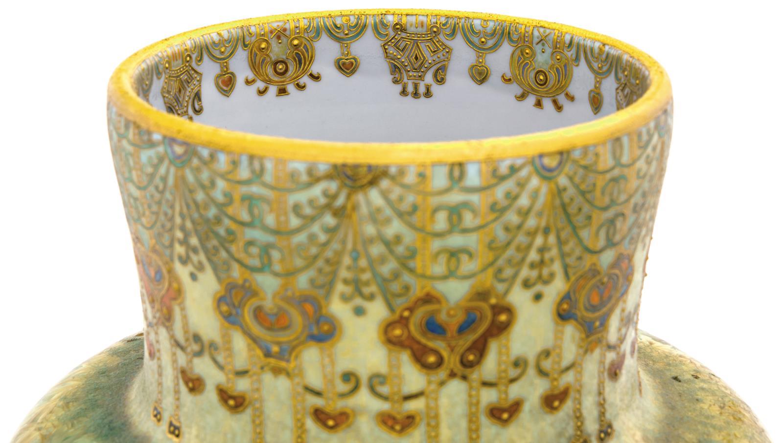 Signed: hand-painted trade-mark in dotted circle, impressed ZSOLNAY PÉCS trade-mark and hand-written 6100