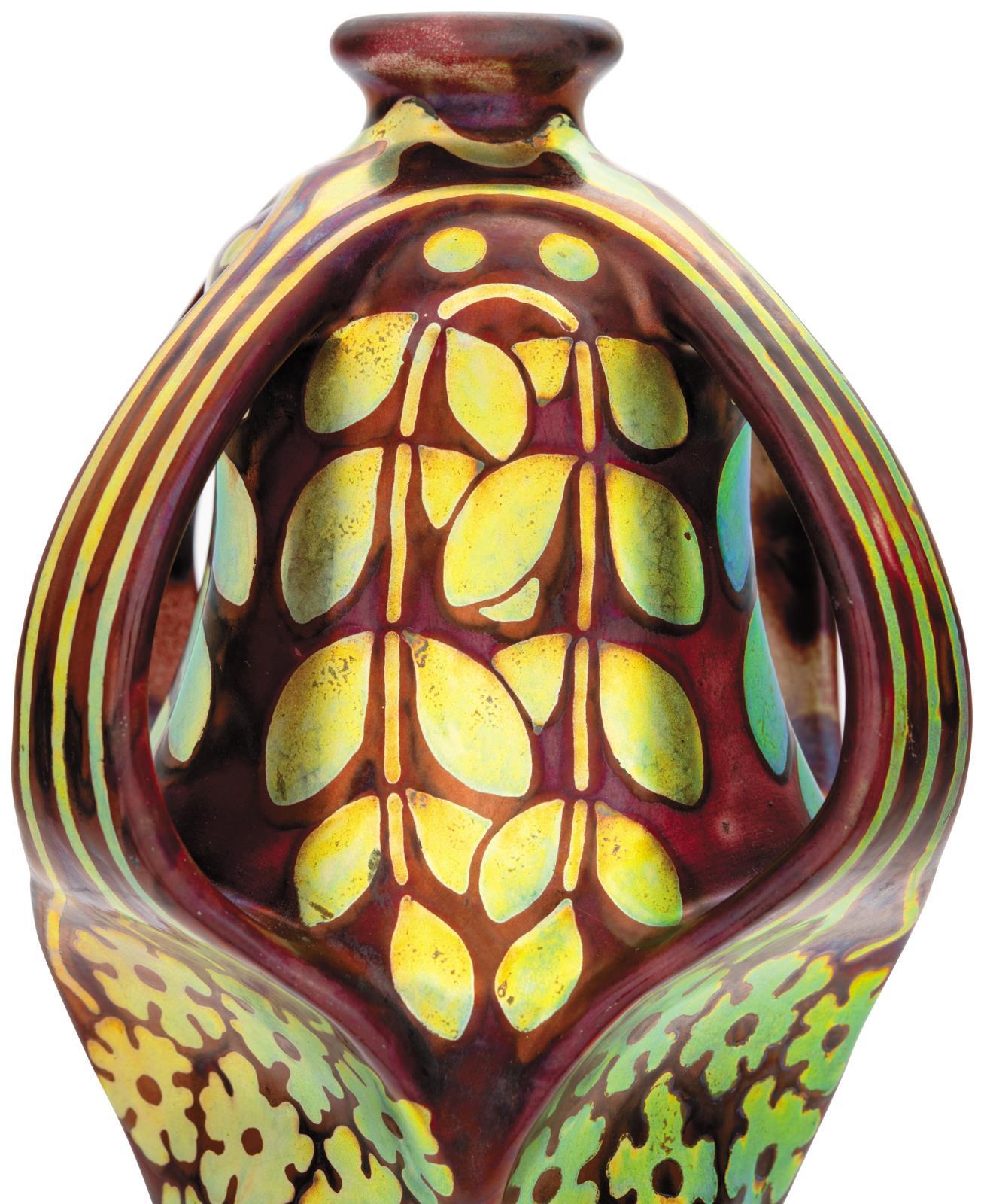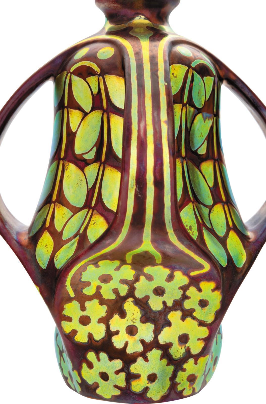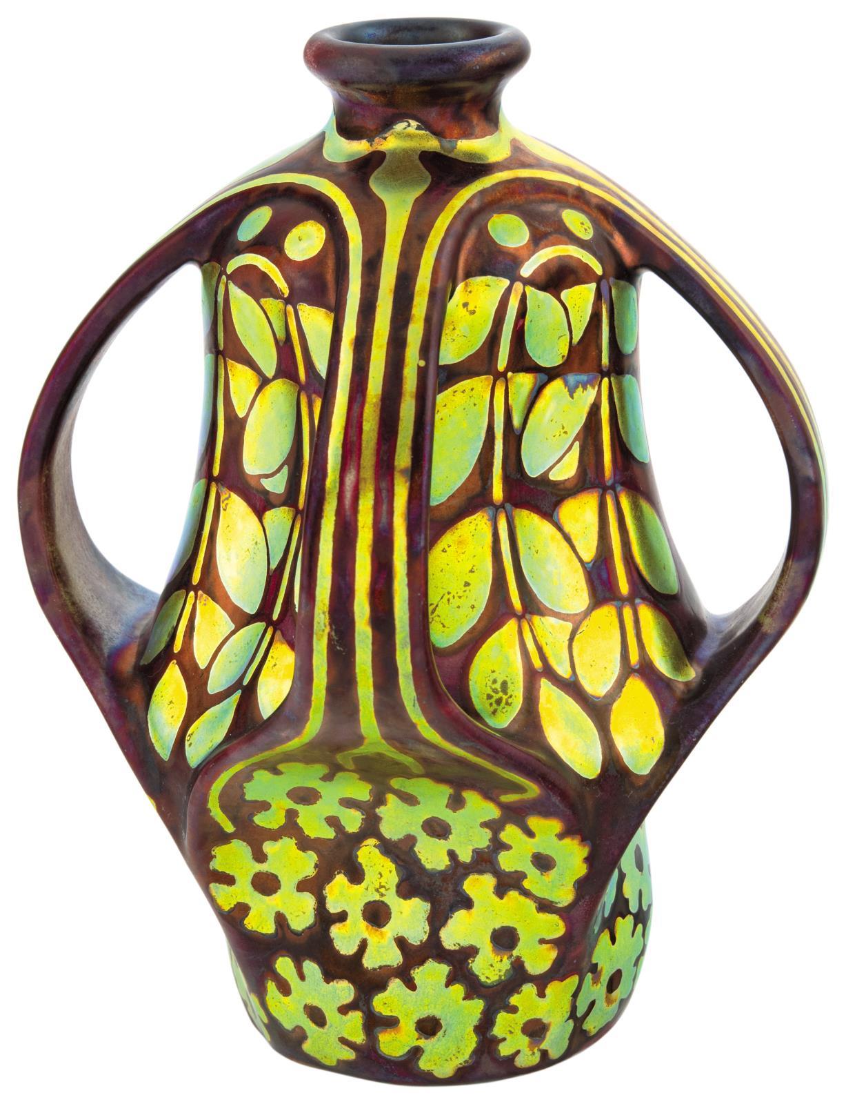 Vase Decorated with Four Curved Handles and Stylized Golden Flowers and Leaves, 1903-1904, Form Plan by: Apáti Abt, Sándor, 1900, Decor Plan: Year: 1903-1904, Joint Decor of Apáti Abt, Sándor and Mack, Lajos