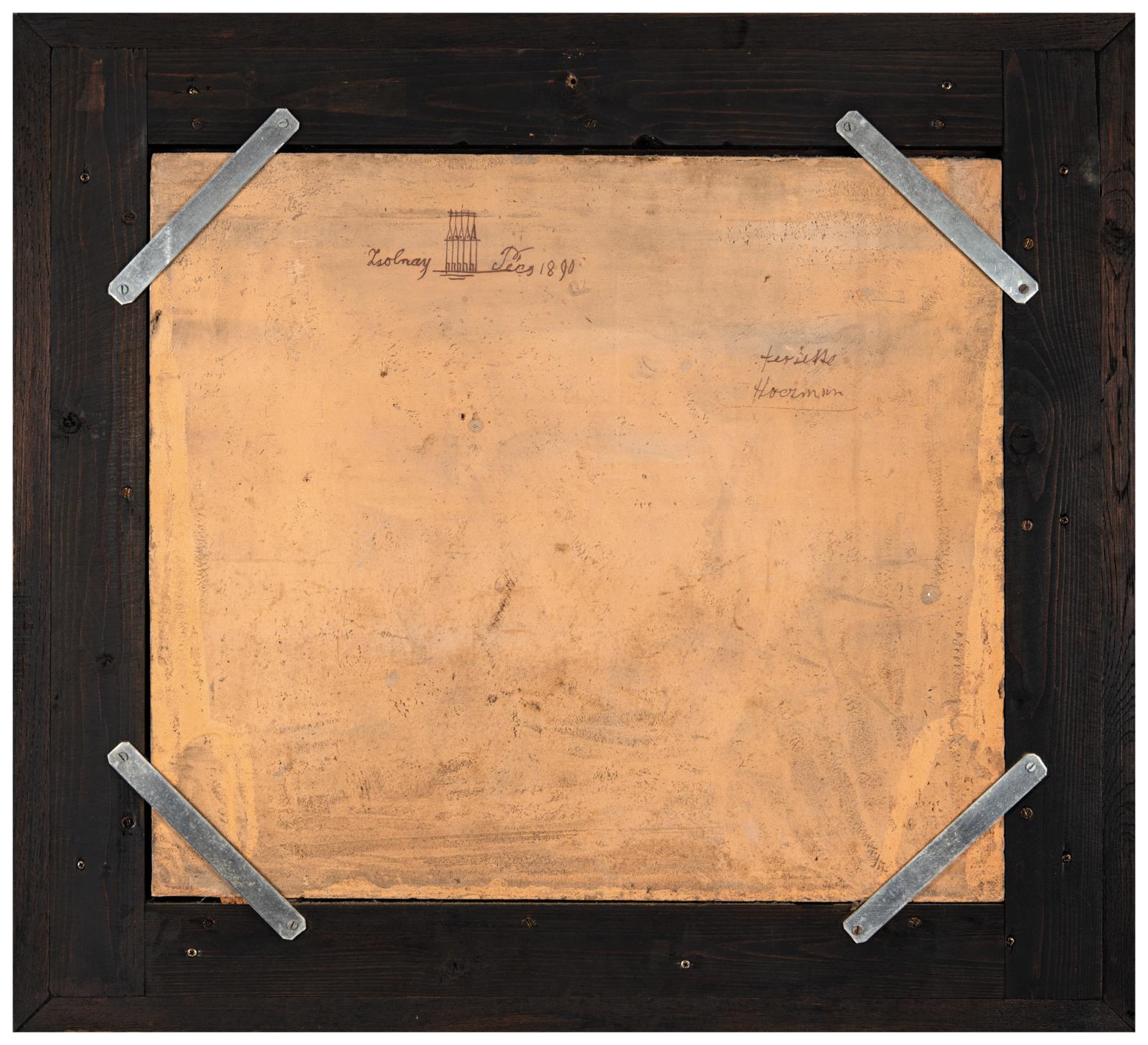 Signed: burnt hand-writing: five-churches trade-mark, Zsolnay Pécs 1890, festette Hoczmann