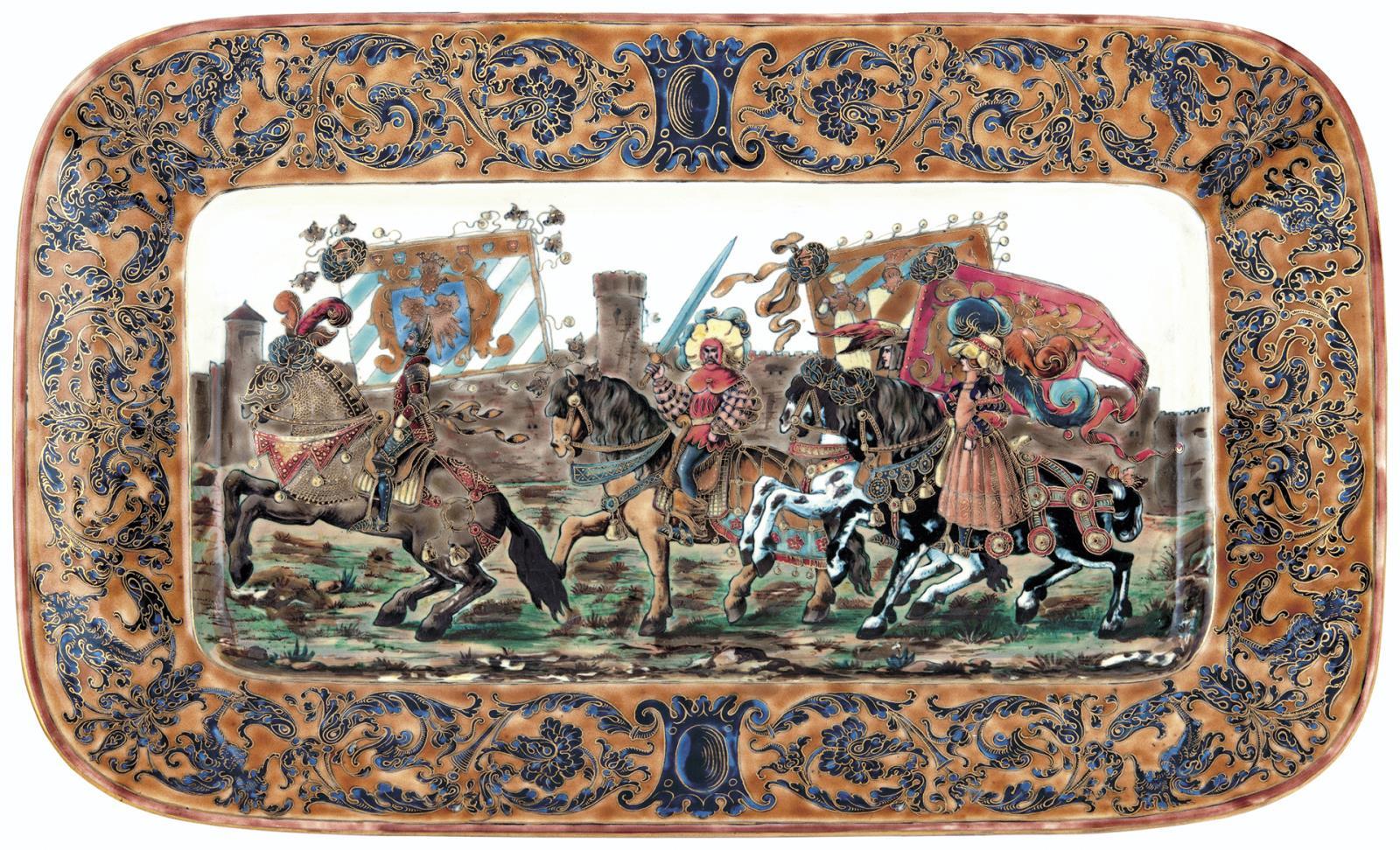 Decorative Plate, depicting medieval Knights, Zsolnay, 1882: Decor plan By: Kaldewey, Kelemen
