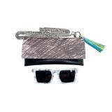 szemüvegtok: bőr; egyedi napszemüveg: acryl: könnyű, tartós és színgazdag alapanyag