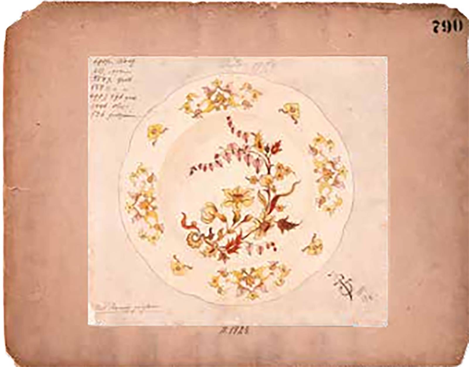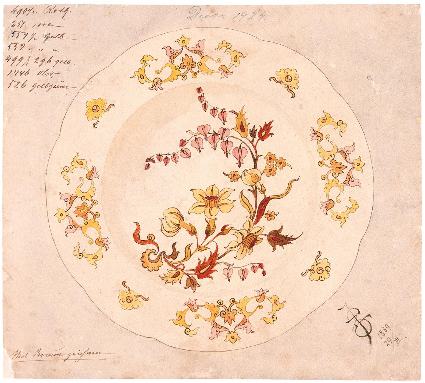 Pattern number 790 for a Plate with Decor number 1924, 1889, DECOR PLAN BY: SIKORSKI TÁDÉNÉ ZSOLNAY, JÚLIA, YEAR: 1889