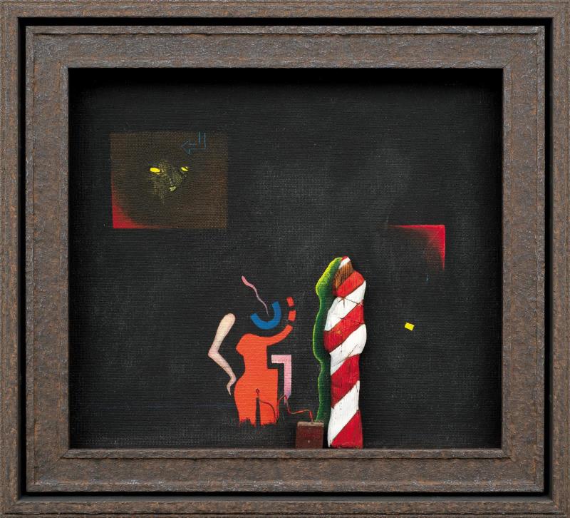 Cím: Ismerkedési jelenet olaj. farost. kollázs. 37 x 42 cm (1975)