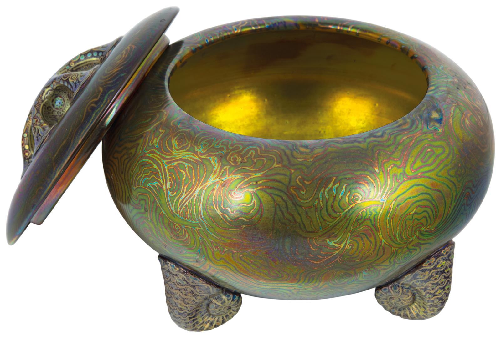 Box with spiral legs, decorated with the so-called Tiffany Technique, Zsolnay, 1913 Design by: Mattyasovszky Zsolnay László, 1912 Design presumably by: Mack Lajos, 1913