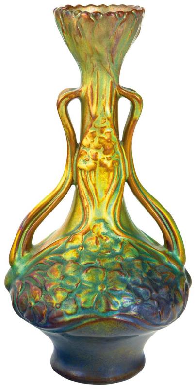 Vase with Floral decor and tendril-shaped handles, Zsolnay, around 1900