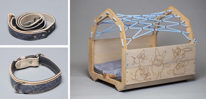 Fekhely: rétegelt lemez, pamut kötél, 55x50x60 cm Póráz: bőr
