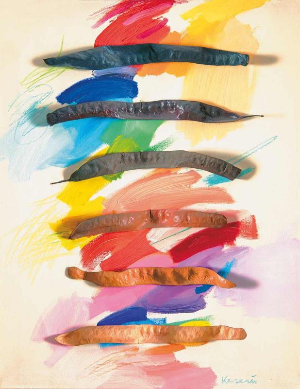 Signed bottom right: Keserü; Signed on the reverse: Keserü «MIND 7» o.v. appl. 70x55x7 cm 1986