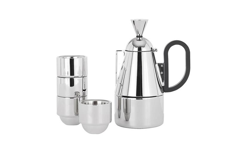 coffee maker and four espresso cups, stainless steel