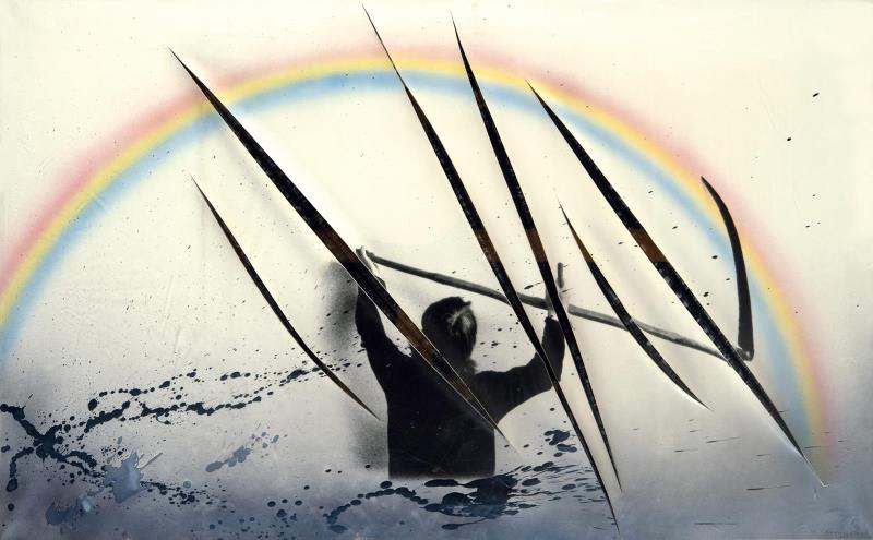 Signed bottom right: Kocsis Imre 1985; Signed on the reverse: "Szivárványkaszás" 80 x 130 cm kasírozott fotó, színes tus, akryl; Signed on the reverse: Kocsis Imre 1985