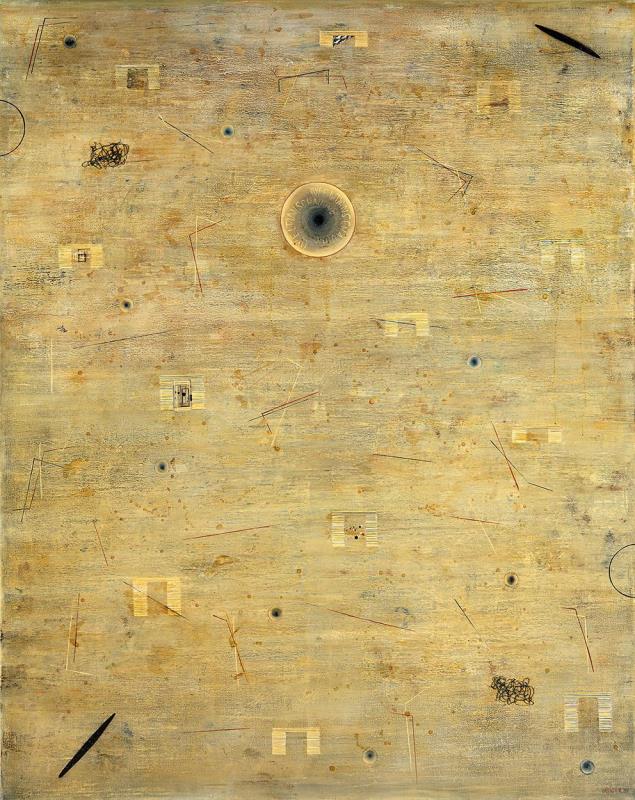 Signed bottom right: Várady R. '97; Signed on the reverse: Várady Róbert: (Világ)szemlélet I. 1997 olaj, trinát, komputer grafika, sellac, vászon 190x150 cm