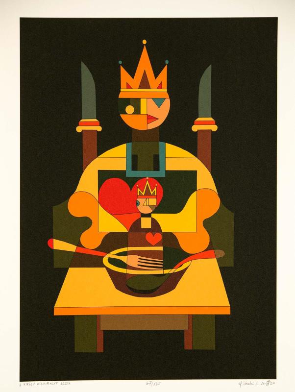 Signed bottom right: ef. Zámbó I. 20 EZI 20, Signed down in the middle: 67/135, Signed bottom left: A KIRÁLY KISKIRÁLYT ESZIK