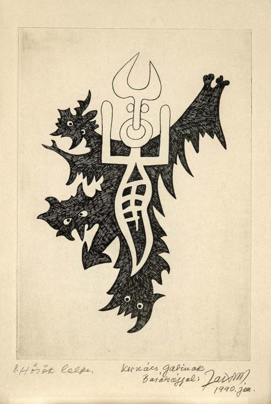 Signed bottom right: Kernács Gabinak barátsággal Jakovits J. 1990. jan., Signed bottom left: 8. Hősök lelke