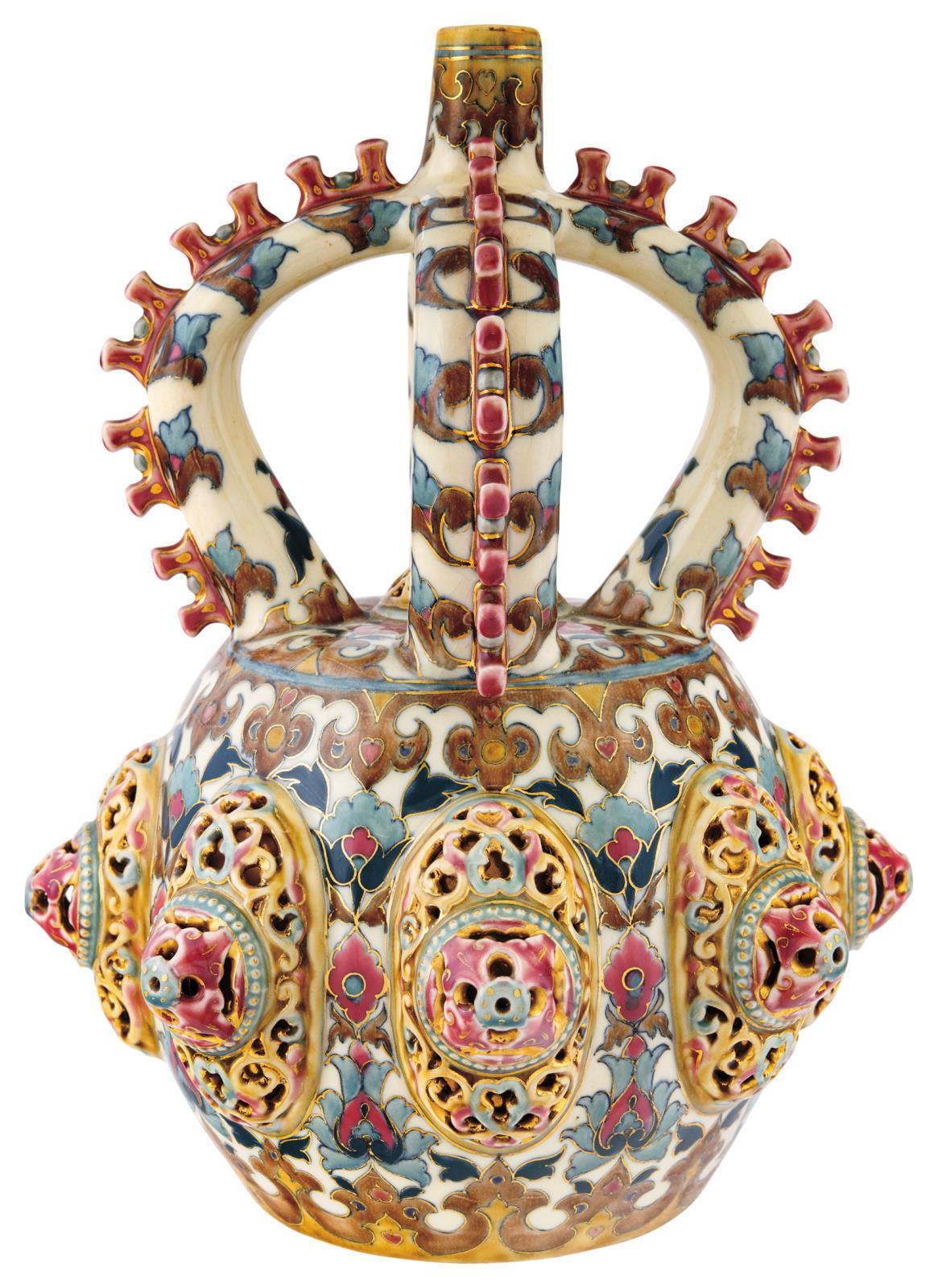 SIGNED with cobalt blue stamped TJM family trademark and impressed ZSOLNAY PÉCS trademark