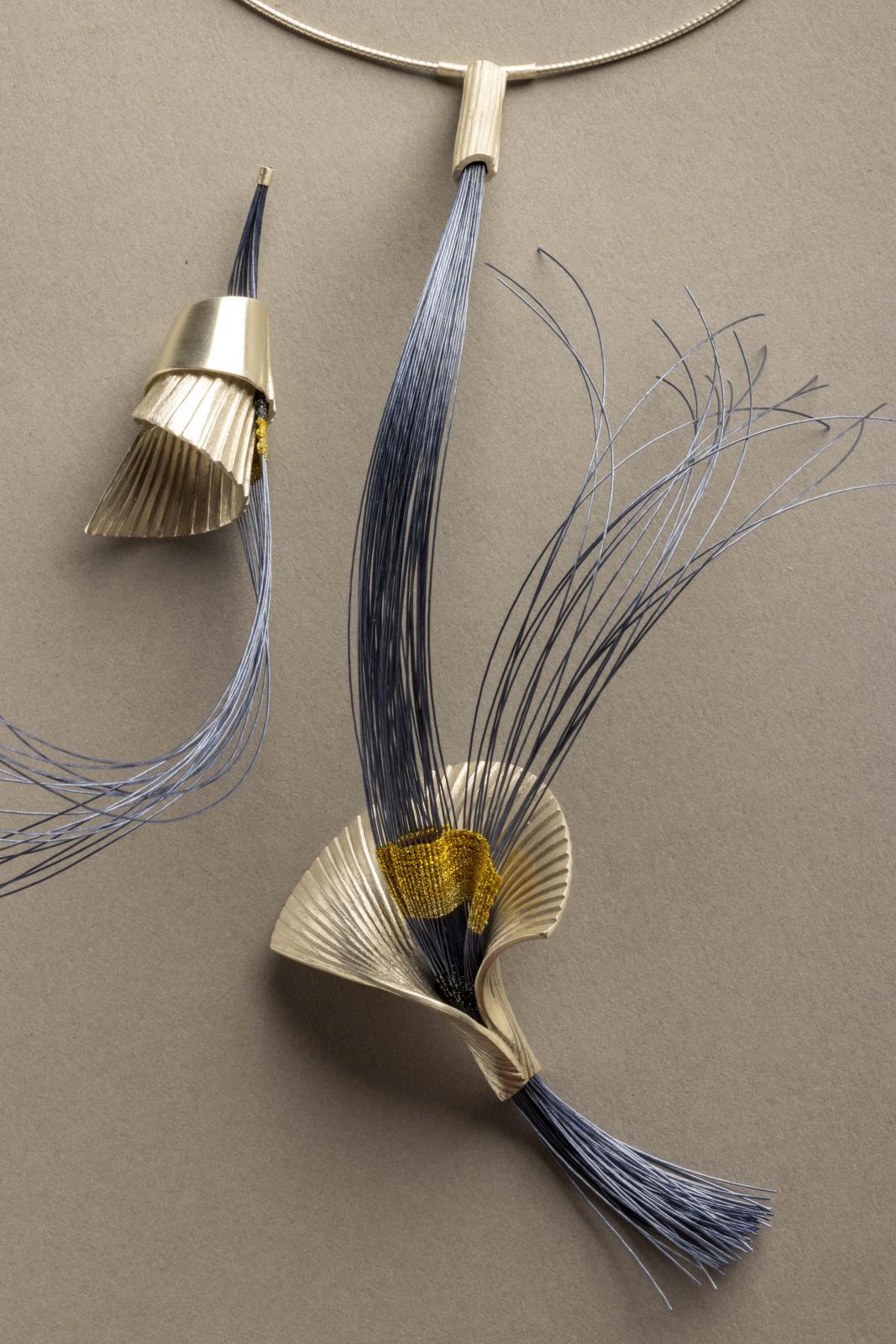 ezüst, sodronydrót, fémszálas fonal/ domborítás, öntés, csomózás