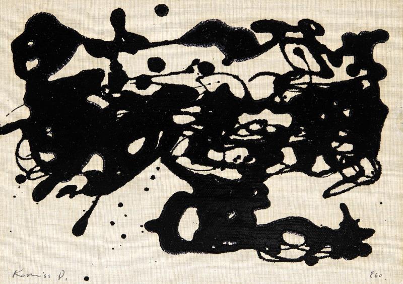 Signed on the reverse: Korniss Dezső, Kalligráfia, 1960. Zománc vászon 20,5x39