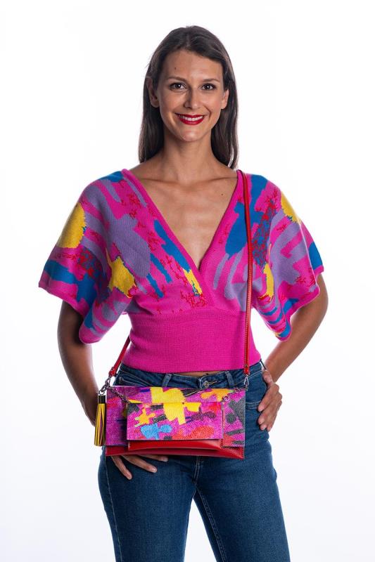 táska: 24 × 5 × 16 cm, 110 cm-es vékony vállpánt és állítható hosszúságú patentos bőr öv; pulóver: S/M