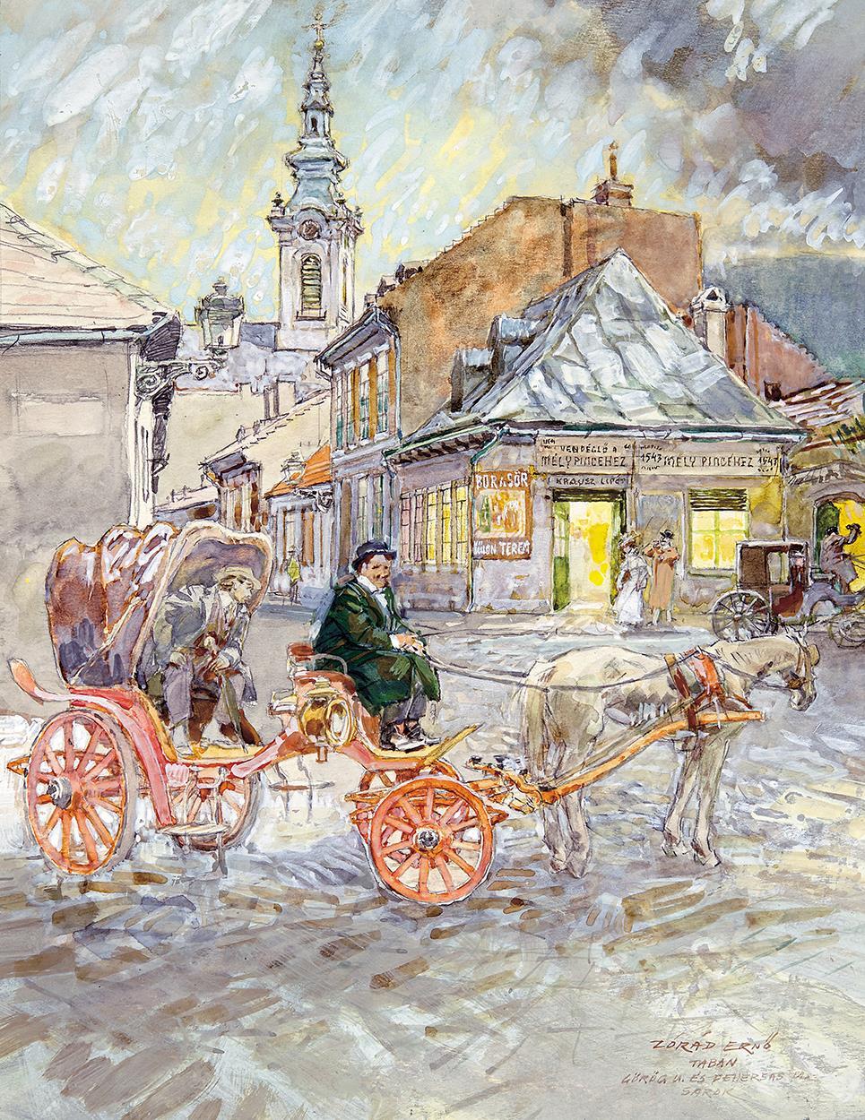 Signed bottom right: Zórád Ernő Tabán Görög és Fehérsas utca sarok