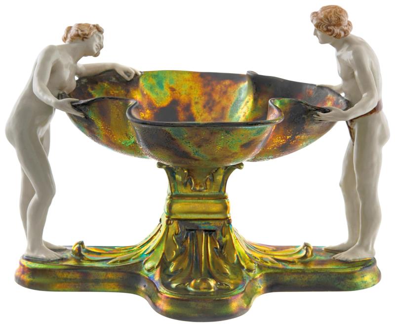 Asztali dísztál, évődő nő- és férfialakkal, 1905 körül, Formaterv: Mack Lajos
