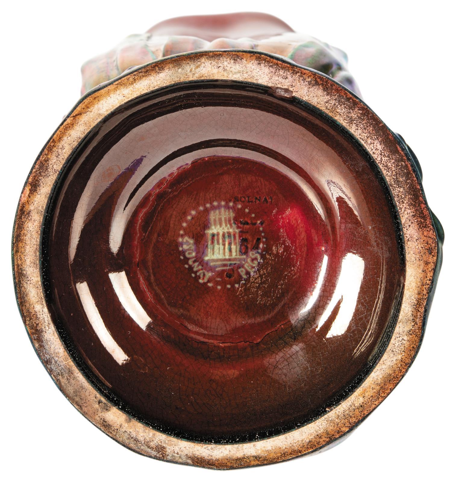 Jelzés: eozinnal festett pontkörös, öttornyos márkajelzés,masszába nyomott ZSOLNAY PÉCS márkajelzés, masszába nyomott 5764