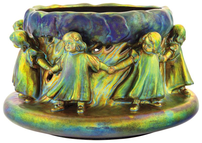 Virágtartó edény, fa körül körtáncot járó lányok reliefjével, 1906, Formaterv: Apáti Abt Sándor, 1906. VII. 24., Mintázás: Bődy Kálmán