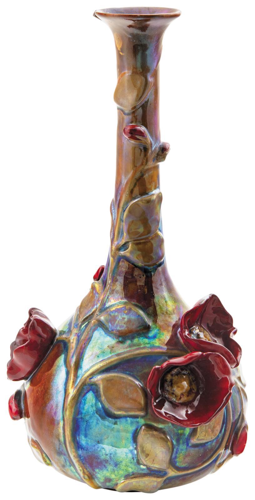 Karcsú nyakú váza, plasztikus virágdíszítménnyel, 1898 körül