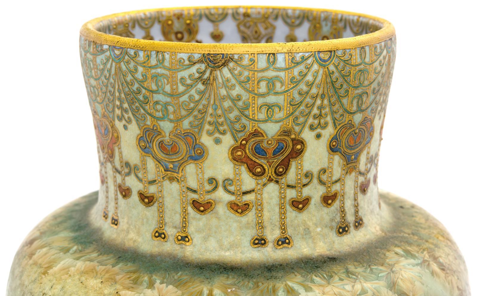 Jelzés: festett pontkörös márkajelzés, masszába nyomott ZSOLNAY PÉCS márkajelzés és kézzel írt 6100