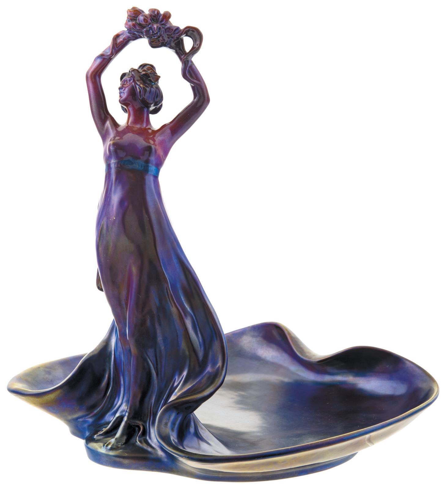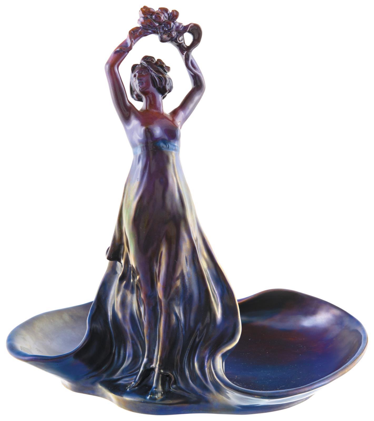 Névjegytartó tál, a tavasz allegóriájával; virágcsokrot tartó nő figurájával, 1902, Formaterv: Mack Lajos